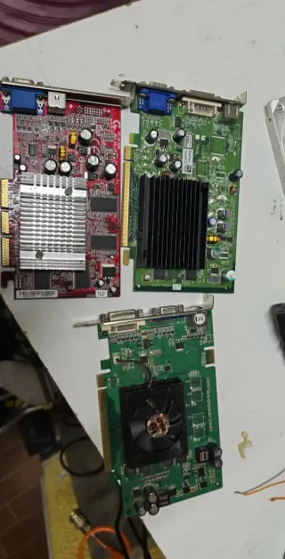 Set di varie schede grafiche per PC, ciascuna con 128MB di memoria. Componenti elettronici per computer. Design vari di schede madri. Connettori di uscita video. Ogni unità costa cinque euro. Potete scegliere quella che preferite.