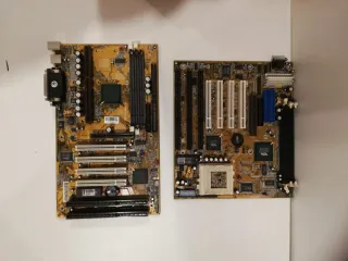 Set di due vecchie schede madri. - Scheda madre marrone con socket CPU. - Scheda madre gialla con socket CPU e connessioni VGA.