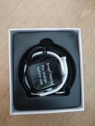 L'orologio nuovo di zecca ha ancora la plastica sullo schermo, viene fornito con la sua scatola originale e i cavi per la ricarica