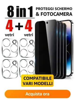 Protezione completa per il tuo iPhone, include pellicole per schermo e fotocamera. - 8 pellicole in totale (4 per schermo, 4 per fotocamera). - Protegge schermo e fotocamera. - Compatibile con vari modelli iphone