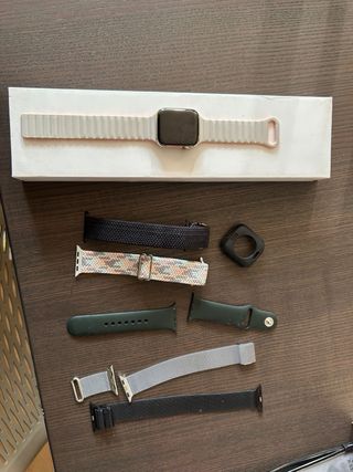 Set di Apple Watch Series 6 con vari accessori per personalizzarlo. Include il caricabatterie originale. - Cinturino rosa originale. - Custodia organizzatrice per cinturini. - Varietà di cinturini in diversi colori e materiali. - Protezioni per schermo e custodia.
