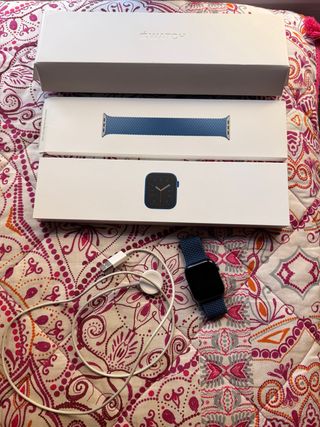 Smartwatch Apple Watch Series 6 da 44mm in colore blu marino. Include caricatore magnetico. Cinturino intrecciato blu.