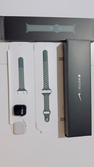 Apple Watch Series 6 Nike Edition in grigio/verde. 40 mm Include due cinturini sportivi. L'orologio si blocca, probabilmente a causa di un difetto nella scheda madre, resiste 1h o 10 minuti o 30 o 2 ore, ideale per pezzi di ricambio o riparazioni. - Scatola originale. - Cinturino sportivo Nike forato. - Cinturino sportivo aggiuntivo. - Caricatore.
