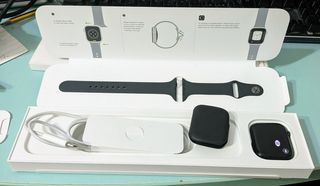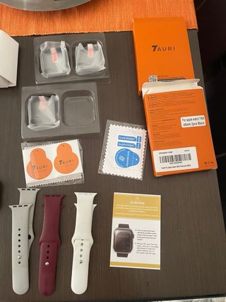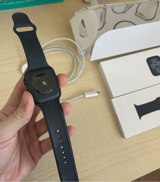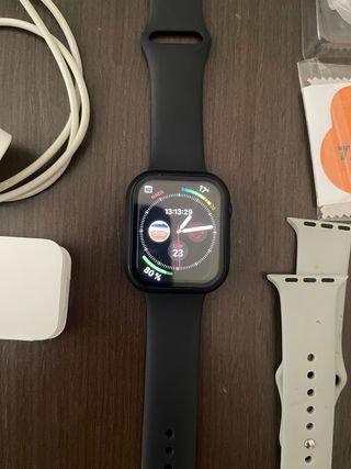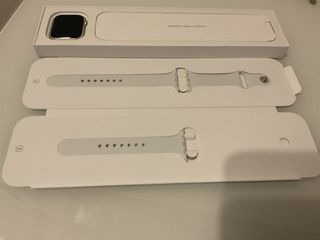 Da 45 mm in perfetto stato, senza alcun graffio. Batteria al 97%. Sempre con protezioni per lo schermo e la cassa. Colore argento. Include tutti gli accessori e la scatola originale.