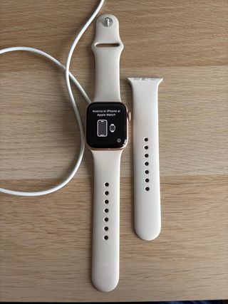 Apple Watch SE da 41 mm in colore beige. Molto poco usato! 2ª generazione - Misura: 41 mm - Taglia: S/M - Colore crema - Include cinturino di ricambio e caricatore - Versione iOS attuale: 10.6.2 - Salute batteria: 95% - Materiale: alluminio - Schermo Retina - Chip S8 - Rilevazione impatti - Resistente all'acqua fino a 50 metri.
