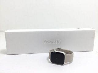Apple Watch Series 8 (GPS) Alluminio 45MM. Cassa in alluminio Starlight. Elegante, comodo e versatile sia per lo sport che per l'uso quotidiano. Aggiornato a watchOS 26.3. Capacità massima della batteria 82% (fotografia 4). Lieve segno di utilizzo sul cristallo (fotografie 5,6). Stato 9 su 10. Include caricatore tipo C e 3 cinturini in silicone (starlight, blu e verde menta. Fotografia 10).