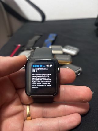 Apple Watch con schermo da 41mm, in colore nero e dettagli dorati. La capacità massima della batteria è del 96%. - Schermo da 41mm. - Colore nero - Cinturini e caricabatterie inclusi **Prezzo negoziabile**