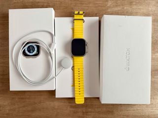 Apple Watch Ultra con cassa in argento e cinturino giallo in perfetto stato, senza graffi o difetti, con tutte le scatole e il caricatore magnetico.