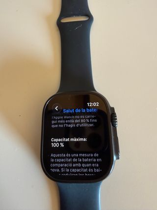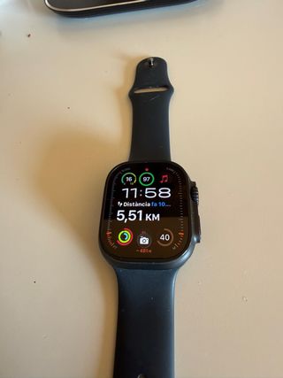 Smartwatch Apple Watch Ultra 2 in colore nero. Un dispositivo elegante e funzionale. Scatola in titanio. Schermo sempre attivo. Resistenza all'acqua. NON INCLUDE LA SCATOLA MA IL CARICABATTERIE. SOPRA IL GRANDE PULSANTE C'È UN COLPO. SALUTE DELLA BATTERIA AL 100%