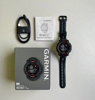 Smartwatch Garmin Instinct 3 Solar, colore nero e grigio. Ideale per chi cerca un dispositivo robusto e funzionale. - Ricarica solare per una maggiore autonomia. - Design resistente e adatto all'attività all'aperto. - Include cavo di ricarica e manuale. -prova d'acquisto disponibile, garanzia.