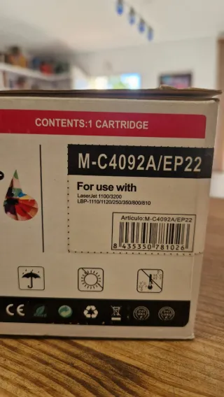 Cartuccia toner compatibile M-C4092A/EP22. Ho 2 unità. 8 € per unità. Sconto per entrambe. Compatibile con stampanti LaserJet 1100/3200 e LBP-1110/1120/250/350/800/810. Contenuto: 1 cartuccia.