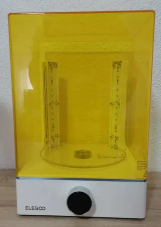 Stazione di cura per stampanti in resina Elegoo. Design moderno in bianco e giallo. Include quadrante di controllo frontale.