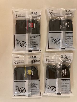 Set di 3 cartucce per stampanti Brother, una gialla, una ciano e l'altra nera. La gialla e la ciano sono in confezione sigillata mentre la confezione della nera è stata aperta per sbaglio ma è perfettamente integra. - Compatibili con vari modelli Brother come indicato sull'etichetta.
