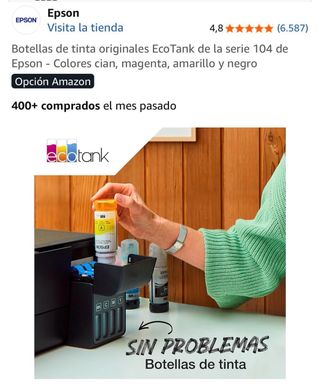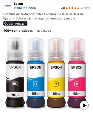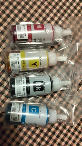 Confezione da 4 bottiglie di inchiostro originali Epson Ecotank serie 104. Recentemente acquistate come si vede nella foto, sono state comprate insieme alla stampante ma non sono necessarie perché si utilizzerà con inchiostro di sublimazione. - Inchiostro Nero (BK) - Inchiostro Ciano (C) - Inchiostro Magenta (M) - Inchiostro Giallo (Y)