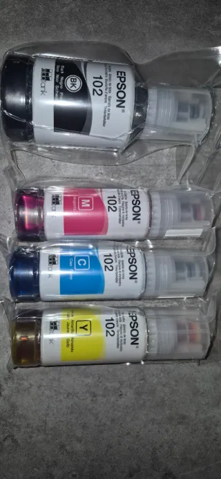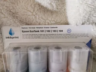 Confezione da 4 bottiglie di inchiostro per stampanti Epson EcoTank. Include i colori: Nero, Ciano, Magenta e Giallo. Modelli compatibili: 101, 102, 103, 104. Nelle foto si vede per quale stampante sono compatibili. Completamente nuovi come si vede nelle foto. SPEDIZIONE SOLO.