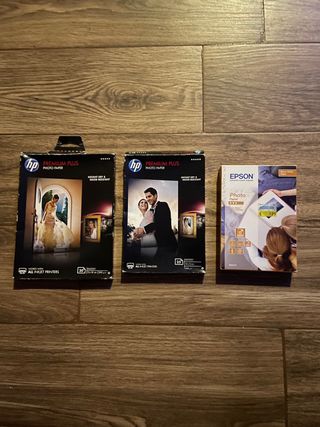 Carta fotografica per stampante fotografica. Le confezioni hp premium sono aperte , nella grande ce ne sono 6, nella piccola 13. Le epson invece sono state aperte ma mai usate , quindi il pacco è come nuovo. Comprate insieme 10€ tutte. Singolarmente il prezzo è da trattare. Scrivetemi 😉