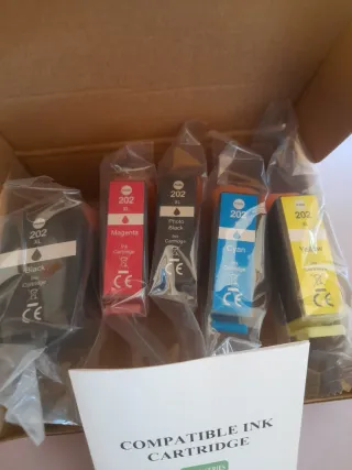 Set di cartucce d'inchiostro compatibili per stampanti. - Serie Epson 202. - Include inchiostro nero, ciano, magenta e giallo. - Ideali per la stampa di documenti e foto.