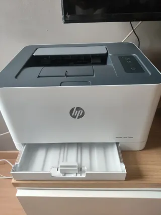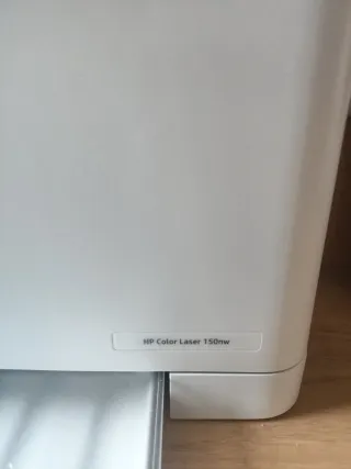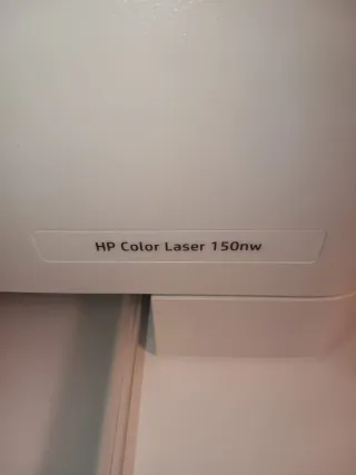 Stampante laser a colori HP Color Laser 150nw, pronta per la rete e con connessione wireless. Ideale per uso domestico o ufficio. Manca il cavo spagnolo e c'è un po' di inchiostro fuori. Stampa laser a colori di alta qualità. Connettività di rete e Wi-Fi. Design compatto e moderno.