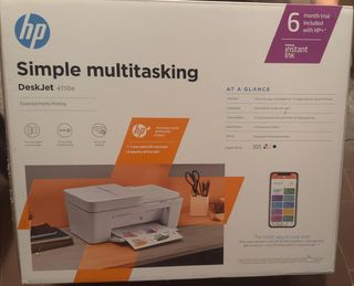 Stampante HP DeskJet 2822e usata una sola volta, perfetta per l'uso domestico. Offre una stampa semplice e affidabile. - Connettività Wi-Fi. - Design moderno bianco e azzurro.