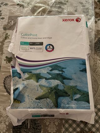 Confezione di carta premium per stampa ColorPrint di Xerox, adatta per stampanti laser e a getto d'inchiostro, sia a colori che in bianco e nero. - Formato A3. - Grammatura di 80g. - 500 fogli per confezione. - Tecnologia ColorLok per colori più vivaci e neri più intensi.