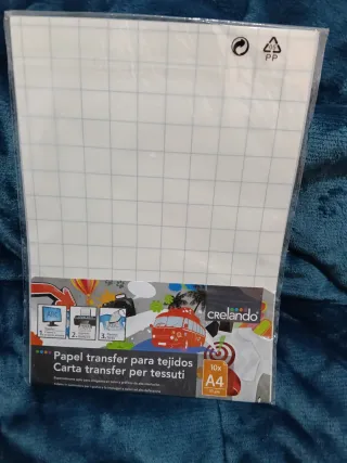 Pacchetto di 9 fogli A4 di transfer per stampanti e fotocopiatrici laser. Ideali per tessuti di cotone, miscele sintetiche, mouse pad, pelle e sottobicchieri. Facili da trasferire e con un tocco piacevole. Istruzioni incluse: stampare a specchio e ritagliare il design. Istruzioni di trasferimento: stirare il capo, posizionare il transfer a faccia in giù, stirare a 190º-30 con pressione media/alta, rimuovere la carta a caldo. Istruzioni di lavaggio: lavare fino a 30º, al rovescio, non usare l'asciugatrice. SPEDIZIONE IN TUTTA LA SPAGNA. CREO CONFEZIONI DI VARI PRODOTTI IN UN SOLO SPEDIZIONE. Ho molti tipi di fogli, guarda il mio profilo!