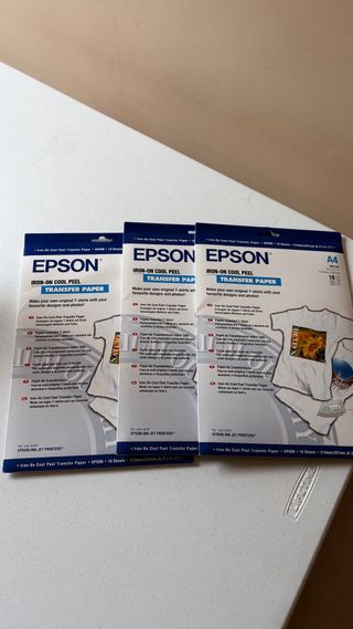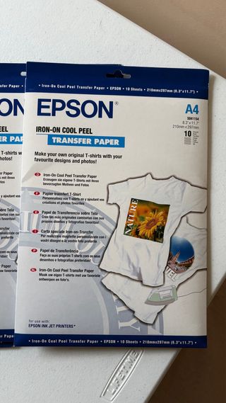 3 confezioni di carta transfer Epson Iron-On (30 fogli) - NUOVO Vendo 3 confezioni di carta transfer Epson Iron-On Cool Peel (per personalizzare magliette e tessuti). Li ho acquistati su Amazon nel luglio 2025 e alla fine non li userò. Stato: completamente nuovi, confezioni sigillate e non aperte. Quantità: 3 confezioni da 10 fogli ciascuna (totale: 30 fogli). Compatibilità: per stampanti a getto d'inchiostro (Inkjet). Uso: ideale per creare le tue magliette, borse in tessuto o design personalizzati con finitura professionale. Formato: A4. Prezzo: su Amazon ogni unità costa 15,72€ (il lotto a 47€). Si può spedire.