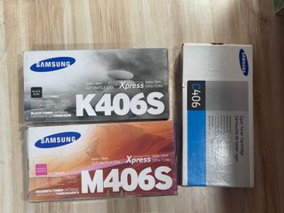 Cartucce toner per stampanti Samsung Xpress. - Toner Magenta CLT-M406S - Toner Giallo CLT-Y406S - Toner Ciano CLT-C406S - Toner Nero K406S non originale. Il CLT-M406S è aperto ma non utilizzato, aperto per verificare se c'era un problema con il toner ma l'errore era in un'altra parte della stampante. La confezione contiene un toner clono e uno originale non utilizzato. Compatibile con Samsung Xpress: SL-C410W, C412W, C413W, C460W, C460FW, C462W, C462FW, C463W, C463FW, C467W CLP-360, 362, 364, 365, 365W, 366, 367W, 368 CLX-3300, 3302, 3303, 3303FW, 3304, 3305, 3305FN, 3305FW, 3307FW Spedizione tramite Wallapop.