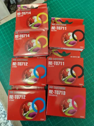 Set di cartucce d'inchiostro compatibili. - Cartuccia RE-T0711 colore Nero (Black). - Cartuccia RE-T0712 colore Ciano (Cyan). - Cartuccia RE-T0713 colore Magenta. - Cartuccia RE-T0714 colore Giallo (Yellow). - Capacità: 13ml ciascuna. Utilizzabili con queste stampanti: Espon Stylus S20 Epson Stylus S21 Epson Stylus D78 Epson Stylus D92 Epson Stylus D120 Epson Stylus DX4000 Epson Stylus DX4050 Epson Stylus DX4400 Epson Stylus DX4450 Epson Stylus DX5000 Epson Stylus DX5050 Epson Stylus DX6000 Epson Stylus DX6050 Epson Stylus DX7000F Epson Stylus DX7400 Epson Stylus DX7450 Epson Stylus DX8400 Epson Stylus DX8450 Epson Stylus DX9400F E