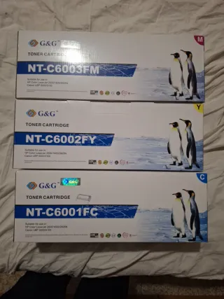 Set di tre cartucce toner G&G. - Modello NT-C6003FM (Magenta) - Modello NT-C6002FY (Giallo) - Modello NT-C6001FC (Ciano) - Compatibili con HP Color LaserJet 2600/1600/2605N e Canon LBP 5000/5100. 3 cartucce nuove ancora sigillate. (Incluse ulteriori 3 cartucce nuove ma aperte)