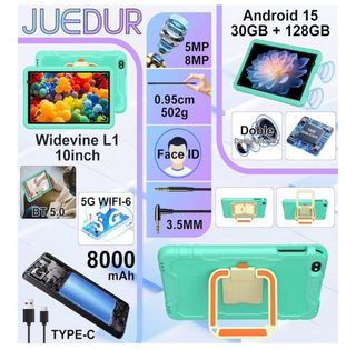 Tablet Dghrti Tab30 con schermo da 10,1 pollici. - Connettività 5G WiFi. - Sistema operativo Android 15. - Memoria RAM da 30 GB. - Archiviazione interna da 128 GB. - Certificazione WideVine L1.