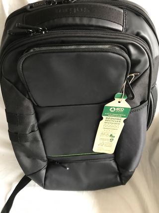 Zaino nero Targus per laptop fino a 15 pollici. Realizzato con materiali riciclati. Doppia maniglia. Scomparto principale imbottito per laptop. Tasche organizzate. Cinghie regolabili.