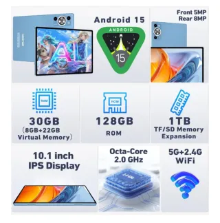Tablet Biegedy in colore blu, include accessori. - Android 14 & Octa-Core 2.0 GHz - Schermo da 10 pollici - 22 GB RAM (6 GB + 16 GB espandibili) + 128 GB ROM & Certificazione GMS (espandibile tramite scheda micro SD/TF, aggiungendo fino a 1TB di spazio di archiviazione aggiuntivo) - 5G+2.4G WiFi & Bluetooth 5.0 & GPS - 8000mAh & Widevine L1 Netflix & FHD - Display - 5MP + 8MP & Doppi Altoparlanti - Include manuale di garanzia europea, Mouse, Tastiera, Caricabatterie, Cavo tipo C, Custodia protettiva, Pellicola protettiva, Manuale utente, Pin di estrazione della scheda.