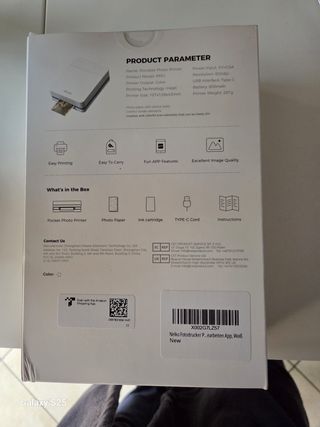Stampante fotografica portatile Nelko PP01, ancora sigillata nella sua confezione originale. - Include 20 fogli di carta fotografica adesiva. - Compatibile con iOS e Android.