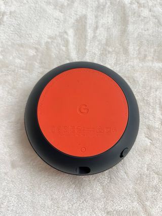 Altoparlante intelligente Google Nest Mini in colore grigio con dettagli in corallo. Include il suo caricabatterie. Design compatto e moderno. Parte superiore in corallo. Base in grigio scuro.