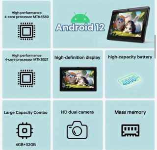 Tablet portatile I-Atar. Tablet P1 touch. Idea per l'apprendimento o l'intrattenimento. Perfetta per l'uso quotidiano. Con sistema operativo Android 12. Schermo LCD IPS HD da 7 pollici. Ha 4GB RAM + 32GB ROM. Archiviazione espandibile fino a 128GB. Batteria 4000mAh. Processore a 4 core. Fotocamere dual da 5MP + 2MP. Servizi Google e GPS. Funzione WiFi. Colore: nero. Stato: nuovo, sigillato. Include cavo di ricarica e manuale utente/istruzioni. Spedisco.