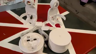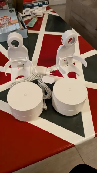 Set di due unità Google Wifi di prima generazione, ideali per espandere la copertura della tua rete domestica. - Design compatto e moderno. - Facili da configurare e gestire tramite app. - Ideali per creare un sistema Wi-Fi mesh. Sono compresi i supporti.
