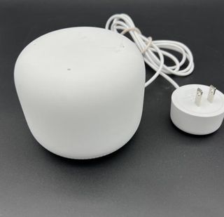 Router Google Wifi in colore bianco. Include il router e il suo caricabatterie. Design circolare e minimalista. Porta USB-C per l'alimentazione.