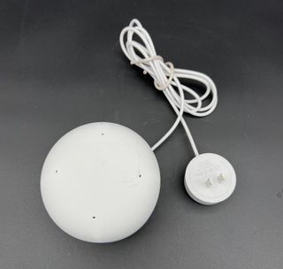 Altoparlante intelligente Google Home Mini. Designo sferico. Copertura in tessuto. Piccola apertura del tessuto, ma non influisce sul suo funzionamento.