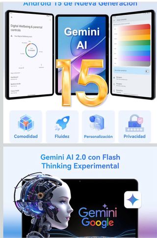 Tablet Gemini Google T80 con schermo da 10.1 pollici e sistema operativo Android 15. - Risoluzione schermo: 800*1280. - Angolo di visione: 178°. - Capacità di archiviazione: 128GB ROM. - Memoria RAM: 18GB. - Include tastiera e penna.