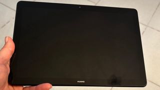 Tablet Huawei in colore nero. - Schermo da 10 pollici. - Design elegante e leggero. Schermo con una striatura.