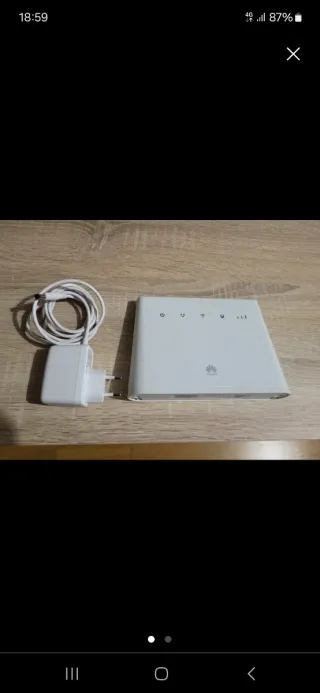 Router Huawei con antenne e alimentatore. Design bianco. Indicatori LED nella parte frontale.