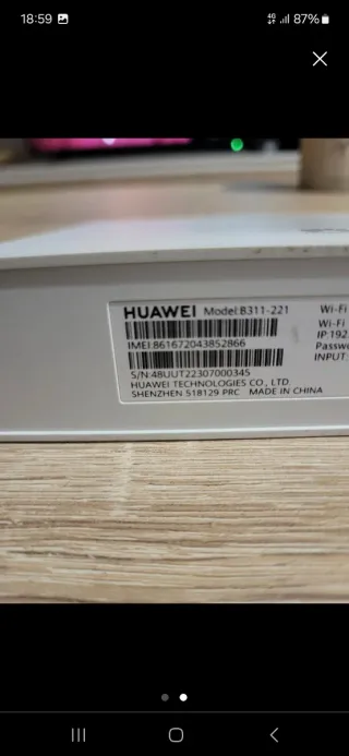 Router Huawei in bianco, con adattatore di corrente incluso. Modello B311-221. Design compatto e moderno. Indicatori LED nella parte superiore.