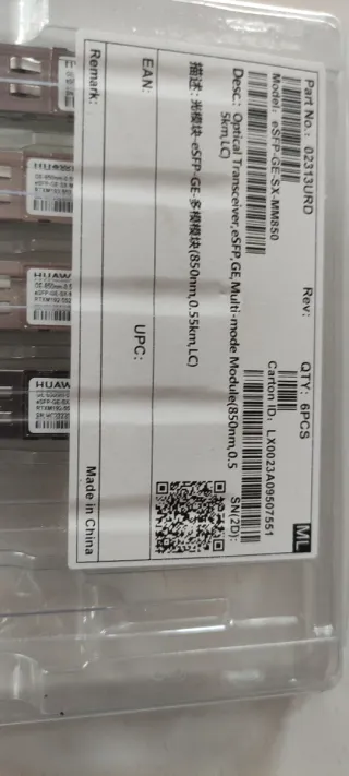 Modulo transcettore di rete Huawei. - Modello: 02313URD - Tipo: SFP GE SX MM - Lunghezza d'onda: 850nm - Prodotto in Cina. - Le quattro unità a 80 euro. Separatamente 25 euro l'unità.