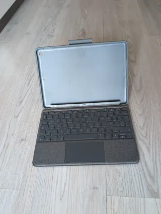 iPad di 9ª generazione con schermo da 10.2 pollici, uscito nel 2021. Colore grigio siderale. Include tastiera. Display Retina. Chip A13 Bionic. Tastiera aggiuntiva a 25€. La tastiera ha un tasto mancante.