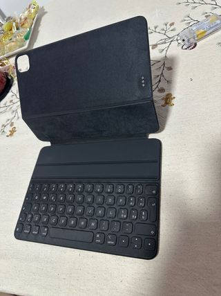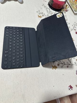Smart keyboard folio per iPad 7. Colore grigio scuro. Tastiera completa e portatile con layout QWERTY spagnolo. Si collega facilmente all'iPad tramite magneti, basta allinearlo e il gioco è fatto. Si piega completamente per fungere da custodia, proteggendo sia lo schermo che la tastiera. Perfetta funzionalità. Presenta segni d'uso, le cornici della custodia sono usurate, è decorata con adesivi e non sono sicura che si possano rimuovere senza lasciare segni. Altre condizioni buone, funzionamento perfetto. 10,5" compatibile con iPad Air 3, iPad 7ª Gen, iPad Pro
