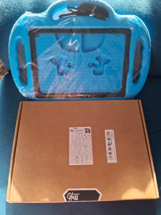 Cover protettiva e vetro temperato per iPad. La confezione contiene 2 vetri. Il pacchetto è adatto per iPad di 6ª generazione, 5ª e iPad Air 2, per iPad da 9,7 pollici. - Cover di colore blu con maniglie. - Include protezione per lo schermo in vetro temperato.