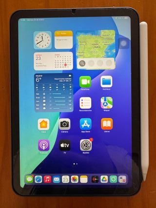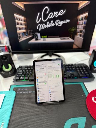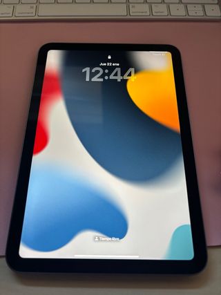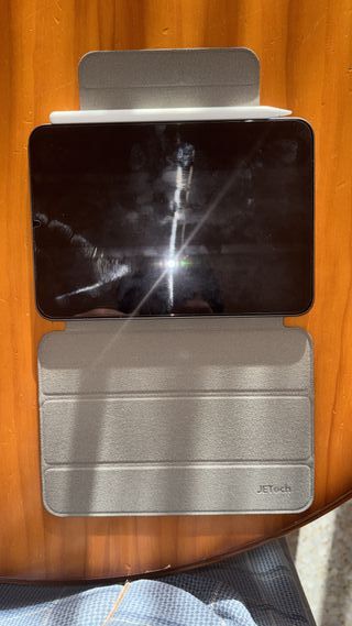 iPad mini di 6ª generazione con 64GB di spazio di archiviazione in colore grigio siderale. In perfette condizioni. Ha un proteggi schermo opaco installato e ne viene incluso un altro nuovo. Include una cover magnetica. In regalo una penna. Si connette tramite Bluetooth, permettendo l'uso toccando lo schermo con la mano.