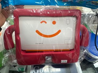 Custodia protettiva per iPad Mini 6 con un divertente design di faccina sorridente. Colore rosso vibrante. Design con maniglie laterali. Proteggi il tuo dispositivo con stile.