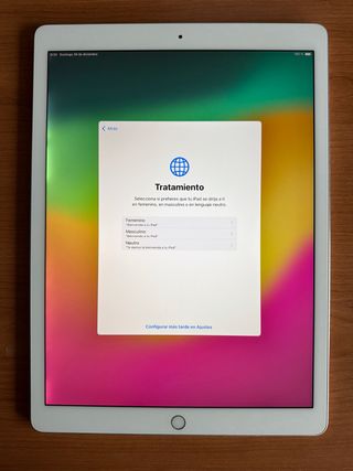 Vendo iPad Pro di prima generazione con due custodie incluse. iPad Pro da 12,9 pollici, modello FLØG2NF/A, colore bianco e versione WIFI da 32 GB. Lo schermo Retina è in ottime condizioni. Quando ci sono colori chiari piatti, si vedono alcuni cerchi (normale con l'età) ma sono impercettibili con un uso normale guardando foto o video. La batteria dura poco senza caricatore, tra 1 e 2 ore. Negli ultimi anni è stato usato per guardare contenuti multimediali collegato alla corrente. Il Touch ID funziona bene. Ci sono alcuni graffi agli angoli ma non influiscono sul vetro. Con le custodie in regalo, gli angoli sono coperti e non si vedono. Includo caricatore e cavo.