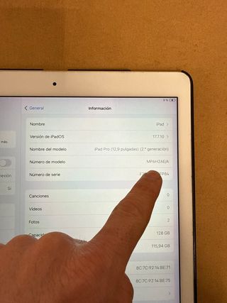 iPad Pro da 12,9 pollici, seconda generazione, in colore argento e con 128 GB di spazio di archiviazione. - Modello: MP6H2AE/A - Numero di serie: F77FP84 - Capacità: 128 GB